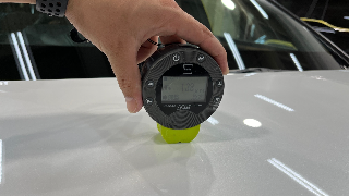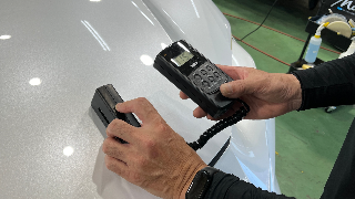 入庫するお車の状態はさまざまで、塗装の状態や厚さも車によっては変わります。昨今の新型車は軽量化に伴って塗装が薄く下地処理作業も慎重に行わないといけません。弊社では磨き職人の勘に加えて、測定器を使用して数字に基づいた施工を行います。