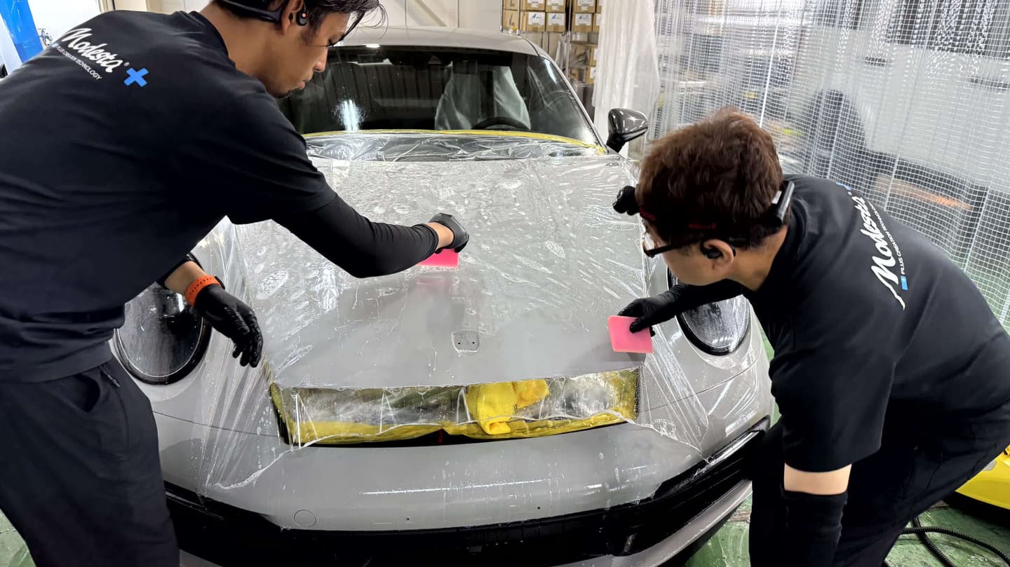 フィルムは車種別、パーツ別に専用のプロッターでカットされた状態のものを施工車両に貼り付けていきます。2次元平面のフィルムを、3次元局面のボディに正確に合わせて貼り付けていく作業は高度な技術が必要です。