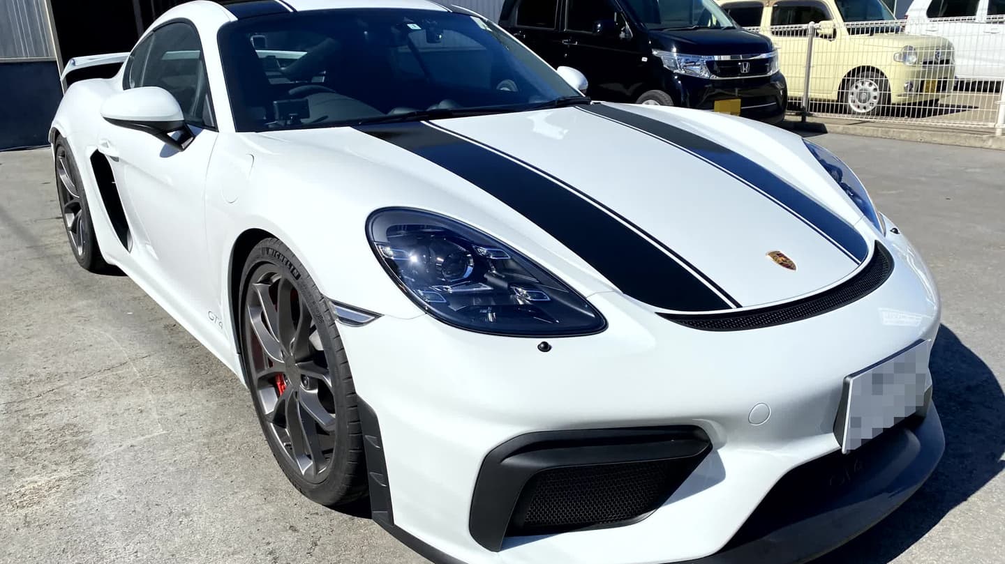 ポルシェケイマンGT4のボンネット、ルーフ、リアエンドまでのストライプ加工です。湾曲しているルーフなどに、正面より真っ直ぐに見えるように施工するのは、技術が必要です。