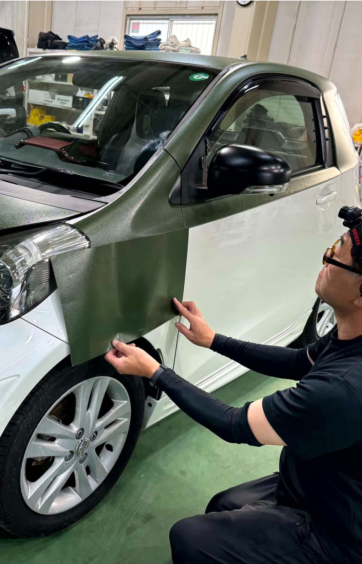 Rugged Marsh Greenという特殊なフィルムでの2トーン施工風景